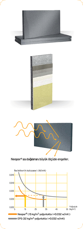 Neopor, düsük yogunluklarda bile isi iletkenlik grubu: 035´e dâhildir. Özellikle mantolama uygulamalarinda EPS ile ayni teknik avantajlara sahiptir. Asagidaki grafikte de görüldügü gibi, standart EPS&8217nin Neopor ile esit isi iletkenlik katsayisini yakalayabilmesi için yogunlugunun iki katina yakin olmasi gerekmektedir
